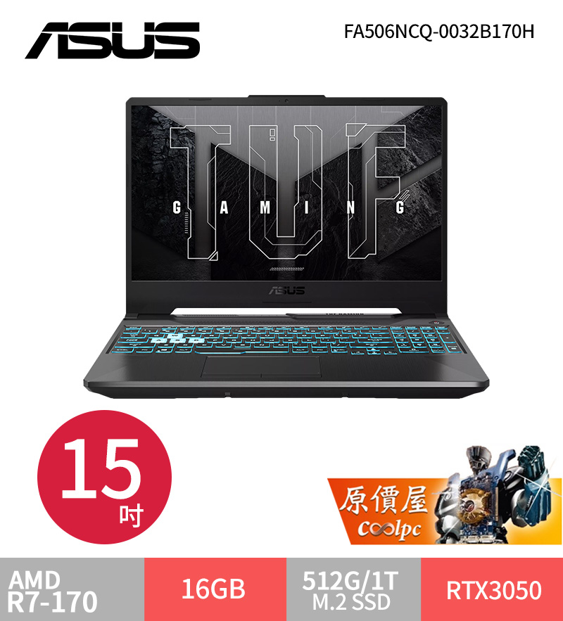華碩 TUF R7-170/RTX3050/16G/512G/15吋 曜石黑 FA506NCQ-0032B170H $34999>蝦皮商城>官網
