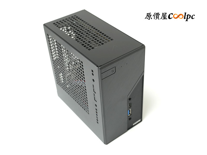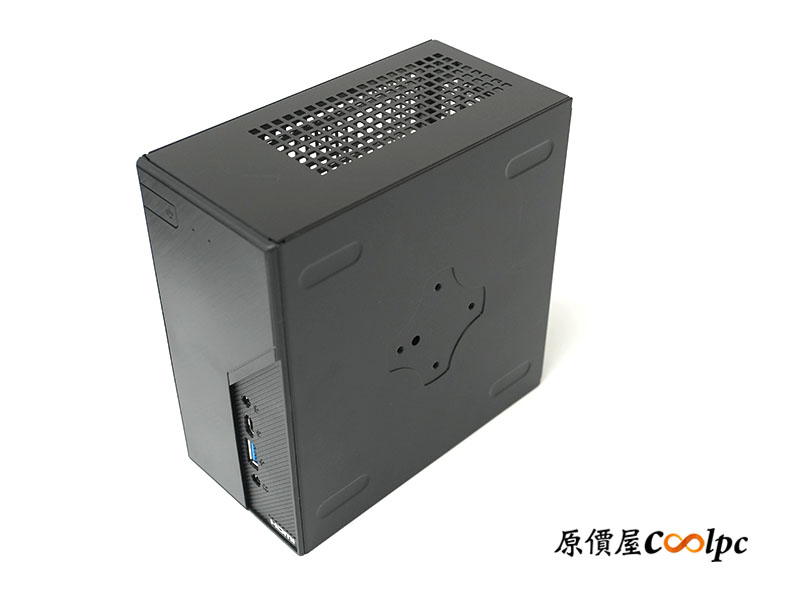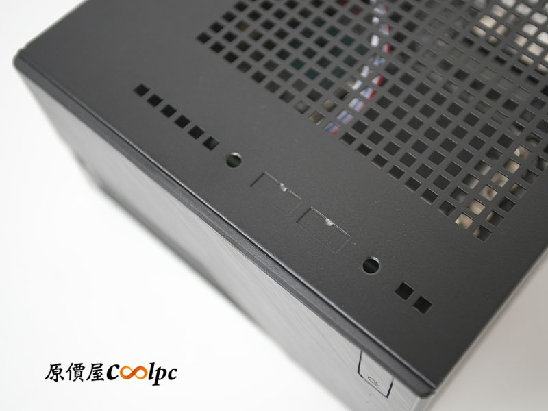 前端 I/O 依序提供麥克風插孔、USB 20Gbps(Type-C)、USB 10Gbps(Type-A)、耳機插孔 (附麥克風)。質感以髮絲紋面板來點綴,頂部佈滿整齊的網狀通風孔,大面積開孔讓 CPU 散熱器的進氣與排熱不受阻礙。在高負載工作或模擬器多開、4K 影音剪輯時,盡可能地保持最高效率。