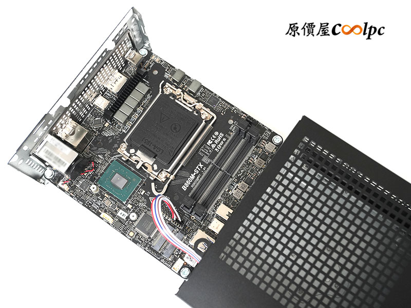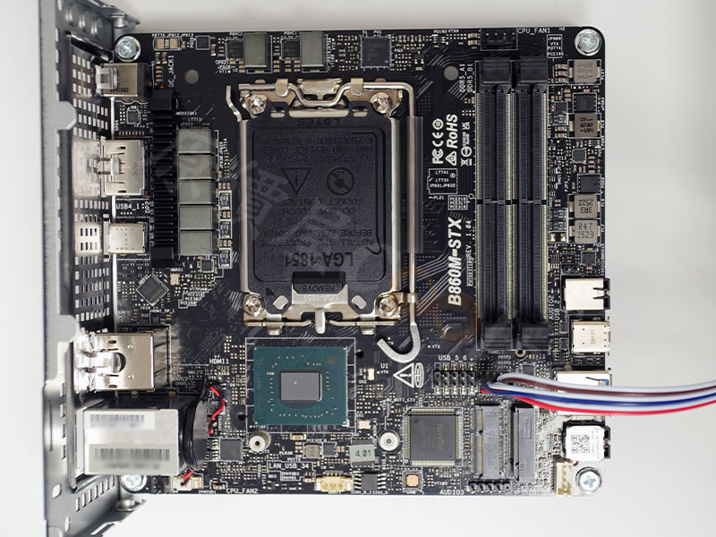 (點小圖放大)主機板型號為華擎 B860M-STX,支援 LGA1851 處理器插槽,完美對應 Intel Core Ultra 200S 桌上型處理器(65W)。主機板支援 2 x DDR5 SO-DIMM 記憶體擴充(MAX 128GB),改用 CSODIMM 記憶體模組最高可達 7200MHz(OC),往下一點則有 M.2 2280 (M2_1) 插槽,支援 PCIe Gen5 x 4 SSD,以及 M.2 2230 Wi-Fi + 藍牙模組擴充槽。