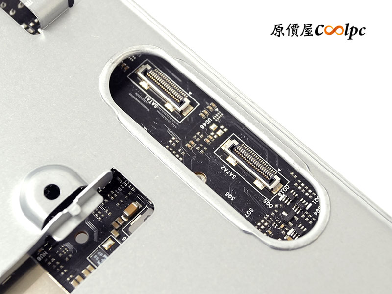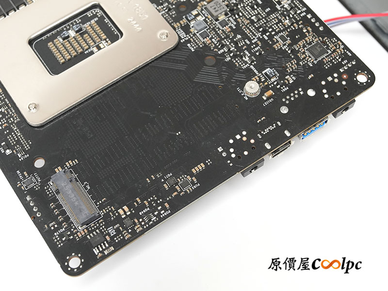 翻至托盤背面,還有兩組 2.5 吋 SATA 硬碟安裝空間,支援 RAID 0/1 磁碟陣列。卸下主機板後,可以看見另一個 M.2 2280 (M2_2) 插槽,支援 PCIe Gen4 x 4 SSD。完善的擴充性讓這台不到 2 公升的小主機能同時安裝四顆硬碟,打造出具備高速與海量存取能力的微型資料庫。