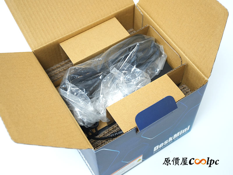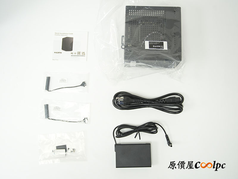(點小圖放大)配件囊括變壓器、電源線、2 x SATA 電源資料排線、螺絲與主機防滑軟墊。變壓器採用全漢 FSP120-ABBU3(3Pin 梅花孔),支援 100~240V 1.4A 50-60Hz 電壓輸入,可輸出 120W(19V 6.32A)。須注意的是華擎 DeskMini B860 系列僅支援 Intel Core Ultra(系列 2)65W 處理器,變壓器提供 120W 供電,旨在確保 65W 處理器在高負載加速(Turbo Boost)時仍然保持穩定供電。