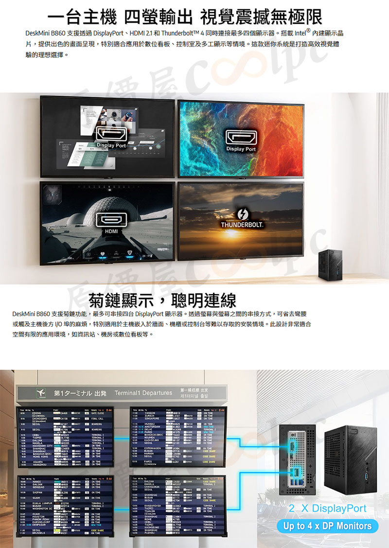 要是您還覺得小主機只適合文書作業,就太小看華擎啦,這台體積僅 1.92 公升、約一本厚精裝辭典大小的華擎 DeskMini B860 準系統,配置 HDMI 2.1、雙 DisplayPort 與最頂規的 TB4 介面,單機提供 4K 四螢幕輸出確實不賴!不論是金融看盤的多螢幕、醫療體系連接專業儀器、顯示卡外接盒都難不倒!用科技界的 Good Guys 來稱呼它是再適合不過啦!畢竟都是小小的又很兇