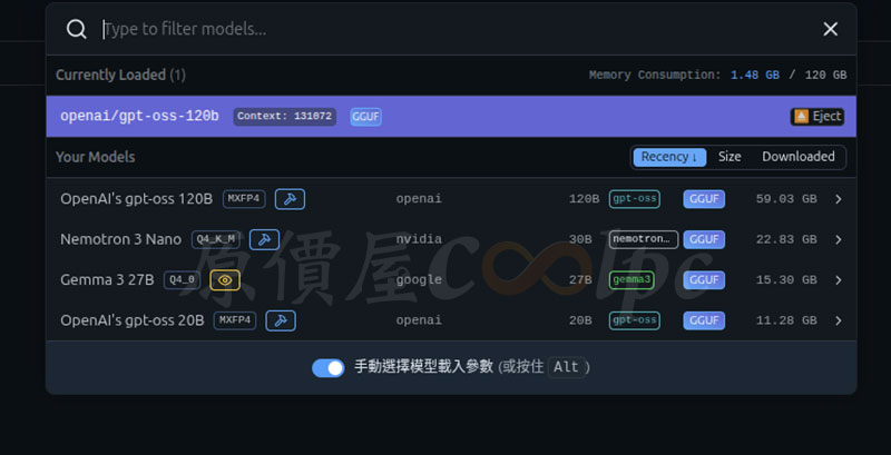 分別下載了 OpenAI gpt-oss 120B、NVIDIA Nemotron 3 Nano 30B、Google Gemma 3 27B、OpenAI gpt-oss 20B 四個訓練好的大型語言模型,內建 128GB 記憶體直接使用 120B 參數模型,也不是問題!