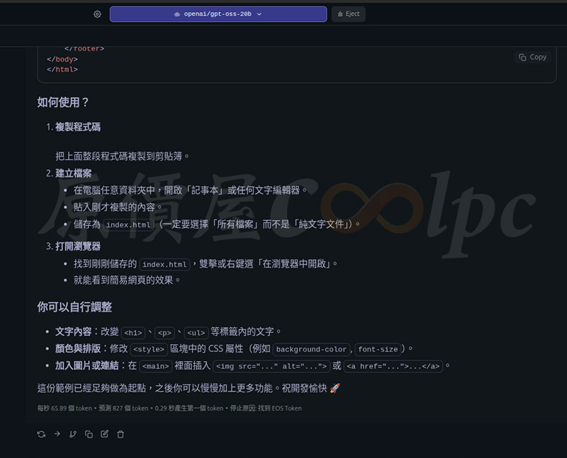 統一要求四個模型設計一個簡單網頁,OpenAI gpt-oss 20B 參數模型獲得每秒 65.89 token,預測 827 token、0.29 秒產生第一個 token。