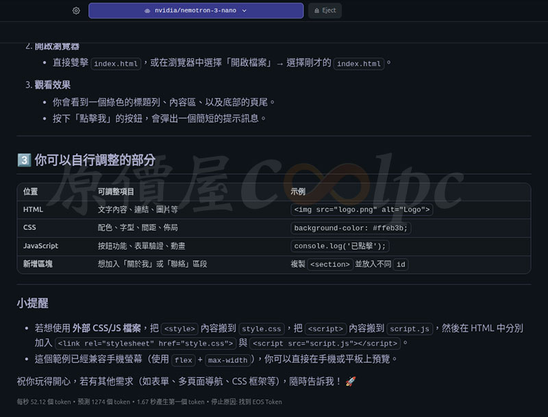 NVIDIA Nemotron-3 nano 30B 參數模型獲得每秒 52.12 token,預測 1274 token、1.67 秒產生第一個 token。