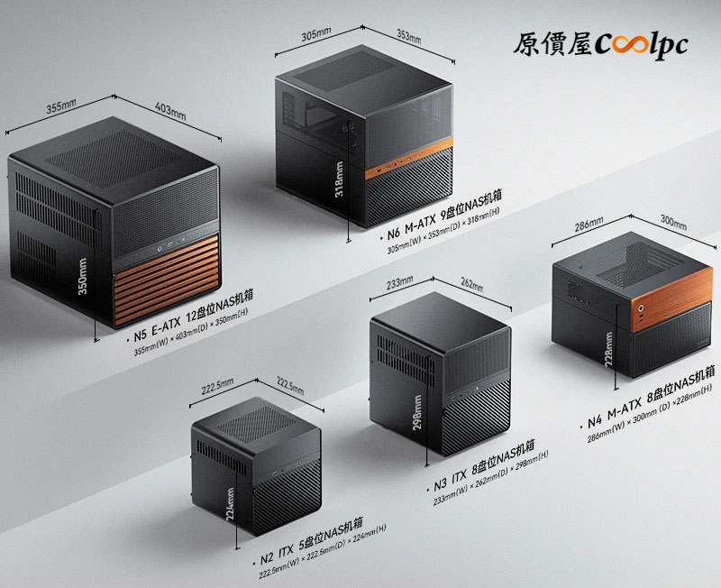 本次主角 N6 (M-ATX 9-Bay) 則在空間與效能間取得最佳平衡,能輕鬆裝入標準全高長顯卡與大型散熱器。至於旗艦 N5,則是以支援 E-ATX 主機板與 12-Bay 的優異規格,提供如伺服器般的硬體相容性。