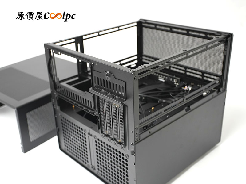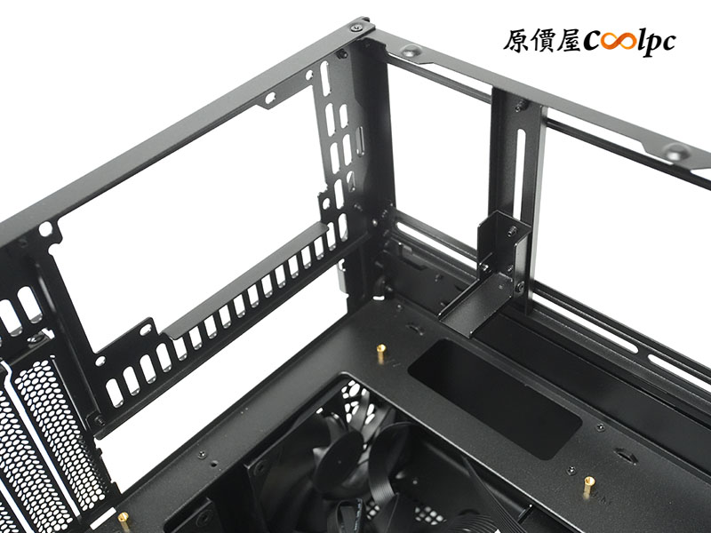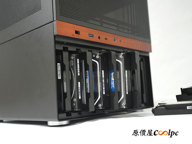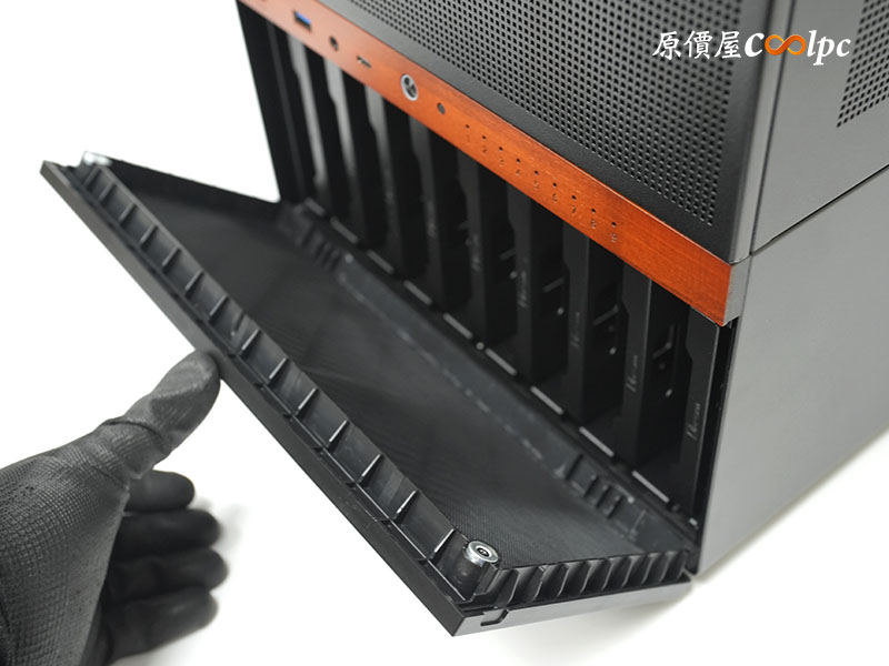 喬思伯 N6 的頂蓋與側板為ㄇ字型一體化設計。內部採用上下分艙的結構設計,上層負責主機板、顯卡與 CPU 散熱;下層則是獨立的 9-Bay 硬碟區,確保硬碟與零組件散熱相互不影響。