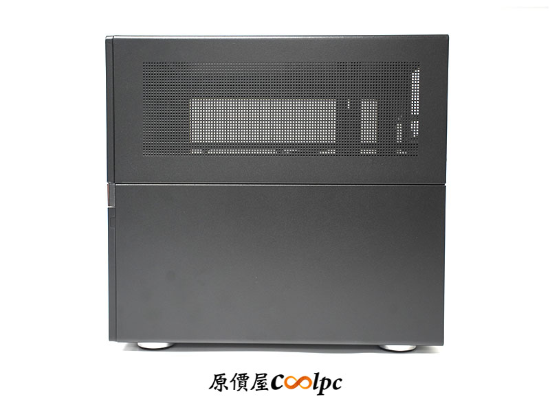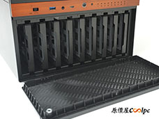 機殼底部設有音響級大型腳座,並附有橡膠緩衝墊,能有效降低 9 顆高轉速硬碟運轉時產生的共振噪音。在靠近後方風扇處設有散熱開孔,主要提供給下置 SFX 電源進風使用。