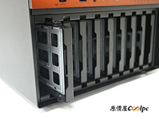 前置 I/O 整合了三段式風扇調速切換開關、主流的 USB 10Gbps Type-C、USB 5Gbps Type-A、耳麥孔、電源鍵(整合 LED)、重新開機鍵,以及 NAS 機殼專屬的 1 ~ 9 號硬碟指示燈。這個 I/O 基本上是十全十美了,唯一可惜之處…開關孔位與檔位標記稍有偏位。但身為實用派的小編,這不影響我對這咖 NAS 機殼的評價!