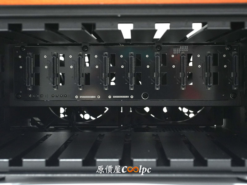 把風扇支架卸除後,可以看見 SATA PCB 板,負責 9 顆硬碟的訊號與供電整合,總共有 9 個 SATA 資料介面,以及  2 組 SATA 供電與 2 組大 4-Pin 供電介面。