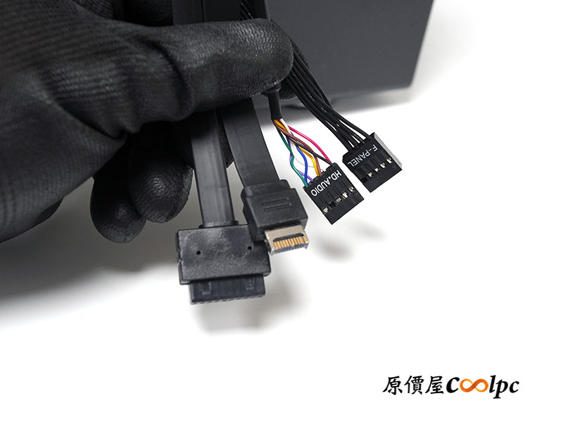 此外前置 I/O 線材提供 USB 10Gbps Type-C、USB 5Gbps Type-A 以及 HD Audio 二合一音源線、POWER SW/RESET SW/POWER PLED 前面板整合線。額外的 SATA 供電 + 3Pin 風扇母頭,可視用戶使用情況決定是否要接,這影響的是機殼前面板的風扇切換是否作用。