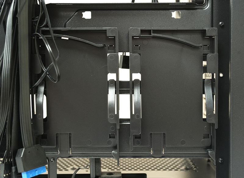 卸下後面側板後,背板的內部結構。也預留大面積的走線槽,背插或傳統線材都能保持整潔。