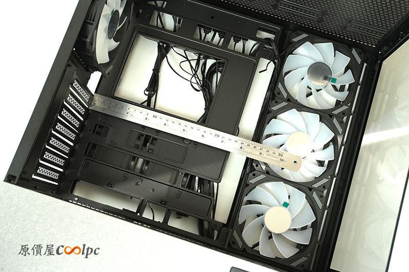 側邊的 3 顆風扇位置,也能自行換裝水冷排的設備。讓你能做雙水冷排搭配,一個 360mm+一個 280mm 的水冷排同時運作。