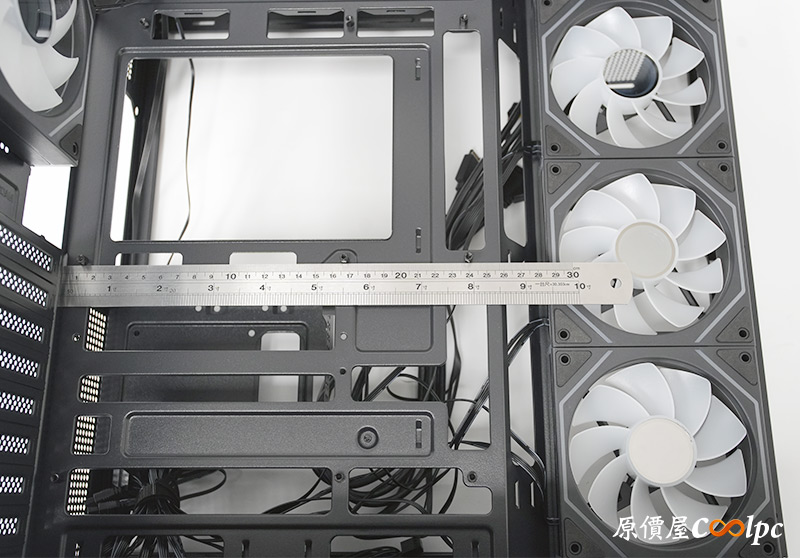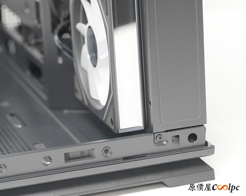 上方風扇支架明顯有向左側偏移,避免與主機板上的散熱模組衝突,這裡可以安裝3顆120mm或2顆140mm風扇。