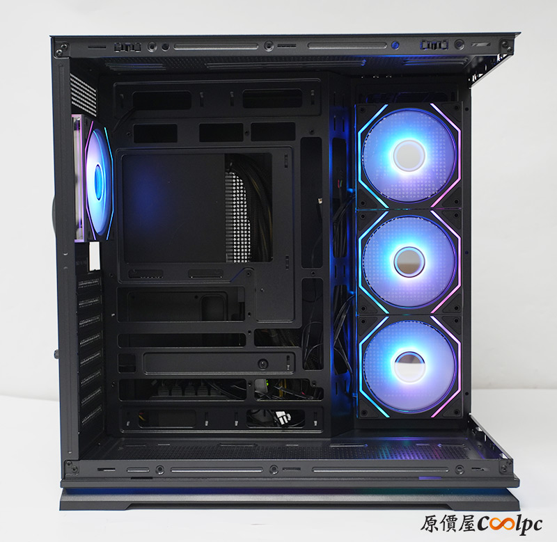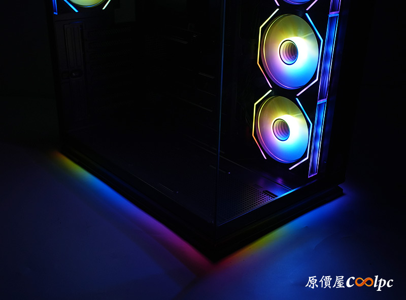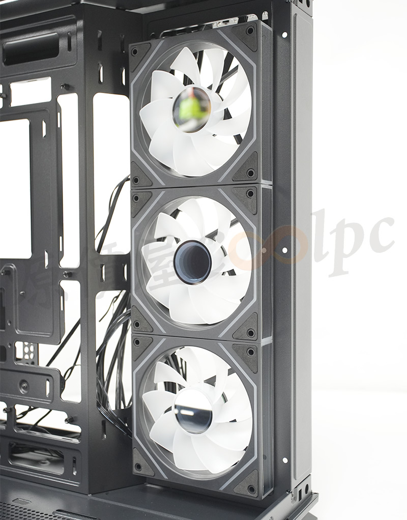 側邊3顆120mm ARGB風扇是反向扇設計,不僅能引導新鮮空氣進入,內側這面的ARGB效果也較好,仔細看還能發現風扇中央有無限鏡像效果,風扇框架上有ARGB燈條,框架側邊也是鏡像設計。