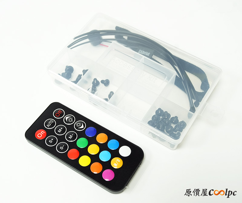 機殼配件提供各式螺絲與束帶、Speaker,還有一個控制風扇燈光、轉速的遙控器,它和機殼內的燈光控制器是一組的喔。