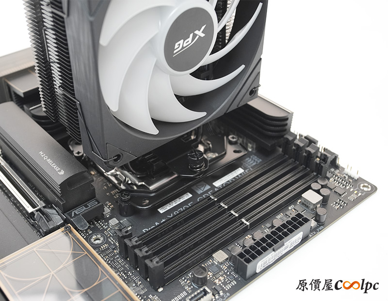實際裝上主機板,XPG MAESTRO PLUS 62DA有偏移設計避免干涉記憶體,大致上已經閃到DIMM 1邊邊了。