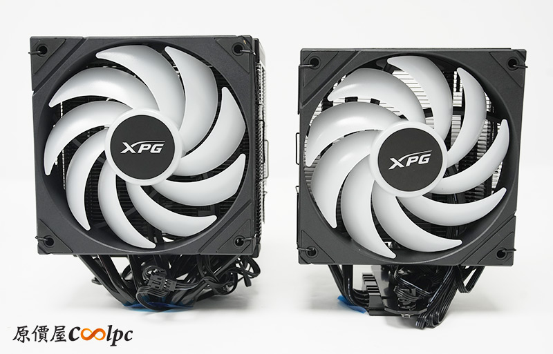先來看一下XPG MAESTRO PLUS 62DA與42SA的主要差異,最明顯當然是62DA擁有雙塔雙扇,散熱鰭片面積與數位顯示面板都更大,還有六支直觸式熱管散熱。而42SA則是單塔單風扇,散熱面積與數位面板相對小,熱導管也減少為四支,其他地方兩者設計大致是相同的。