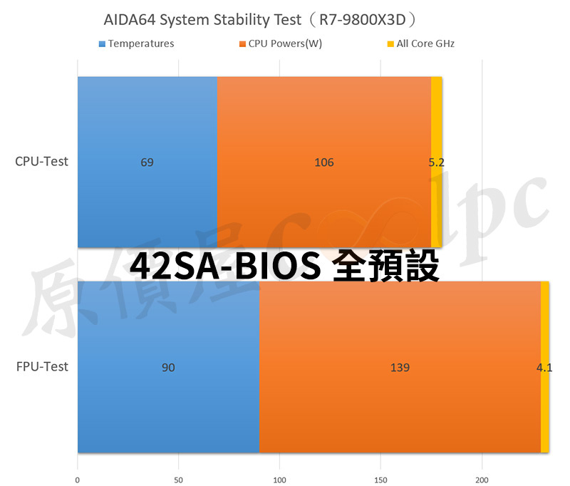 接著將散熱器換為XPG MAESTRO PLUS 42SA,測試平台維持不變,並使用 AIDA64 System Stability 進行 CPU/FPU 壓力測試。