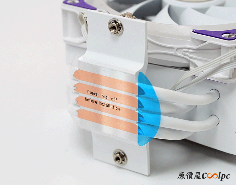 銅製底座採直觸設計,能夠更有效率的將CPU熱能傳至導管中,使用前有一片塑膠膜保護底座,安裝前記得撕下來喔。