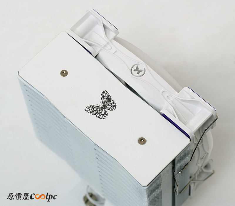 頂部用鋁製頂蓋將熱導管遮住,並且印上SUPERFLOWER蝴蝶標誌,簡約設計相當有質感,而且可以看到一旁的風扇外框也是有蝴蝶造型的喔。