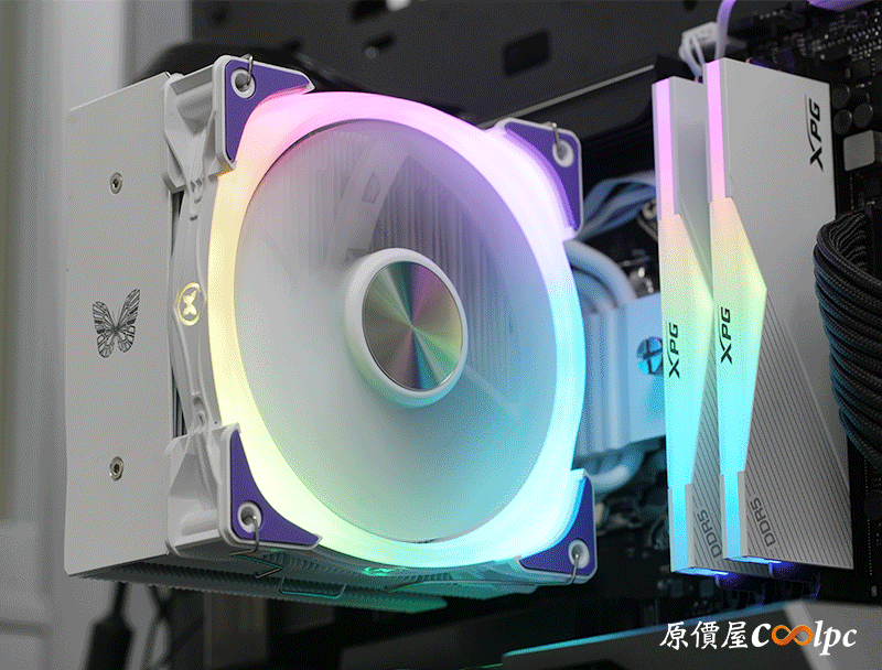 開機後ARGB光環亮起,比起他牌扇葉發光的效果,ST4 ARGB的光環我更喜歡一點,一方面亮度比較適中,再來就是不會完全蓋過鋁製上蓋的風采,相對是在兩者間抓到一個平衡點,相貌這點可以說過關囉。而且可以看到風扇框架上的小蝴蝶開孔也亮起,燈效能透過主機板軟體校調,並且和其他ARGB零件同步。