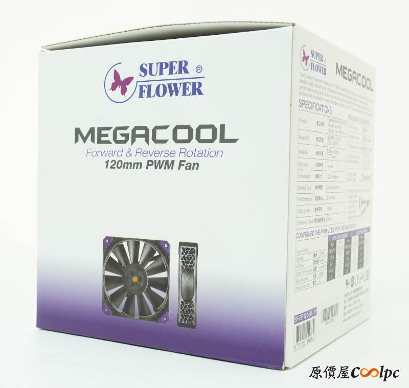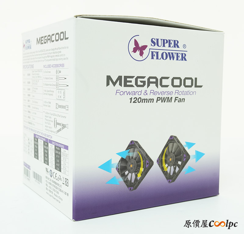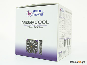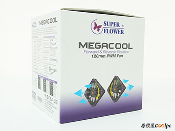 接著是SUPERFLOWER MEGACOOL 120mm PWM風扇,彩盒包裝上有風扇圖照與大大的MEGACOOL字樣,還特別把招牌的三相十二極馬達放大,上方一段文字寫著「第一而且唯一」,肯定是個狠角色。左右兩邊的圖示告訴我們風扇可以變換風向,框架還有加厚強化,背面則有規格表、內容物列表、正反轉性能表可以參考。