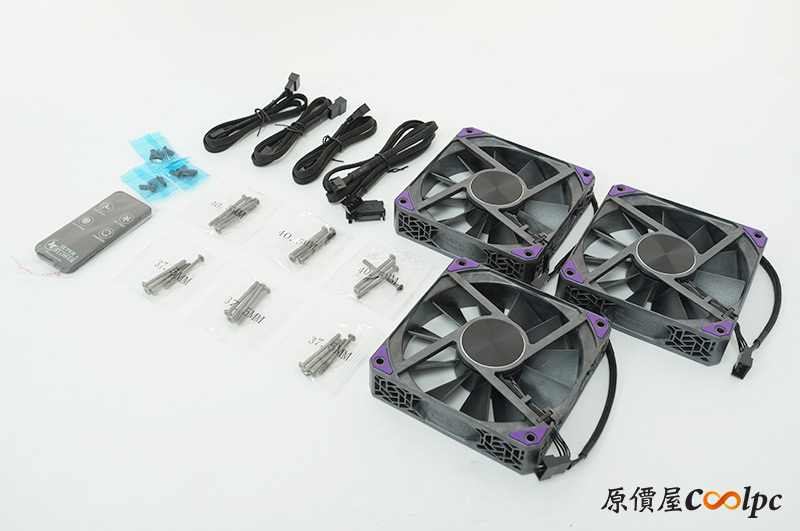 內容物有MEGACOOL 120mm PWM風扇3顆、電源延長線、小4Pin轉SATA供電線、安裝螺絲、遙控器。