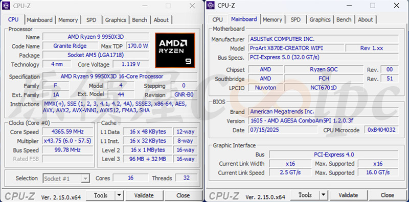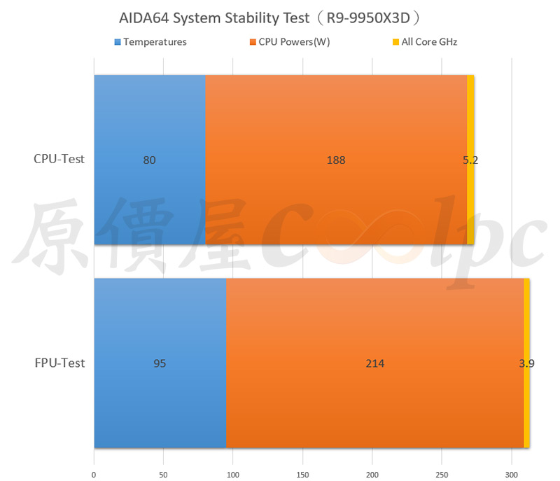 最後測試環節開始,使用AMD RYZEN 9950X3D處理器搭配AIDA64 Extreme軟體,分別針對CPU、FPU進行10分鐘滿載測試(開啟PBO)。
