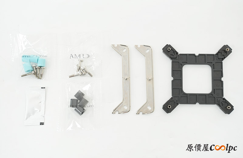 內附Intel平台專用強化背板,螺絲及支撐圓柱按照平台已經分類好,散熱器底座則是Intel/AMD雙平台共用,另外附上一小包散熱膏。