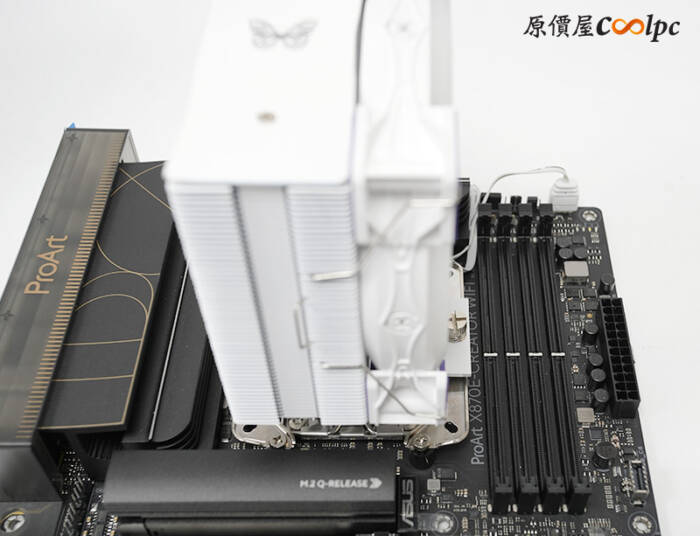ST4 ARGB散熱器本身不大,和主機板周圍的散熱模組、M.2散熱片都還有一段距離,加上有偏移設計,和記憶體完全不會衝突,連記憶體的RGB都不會擋到,這點實在很讚。
