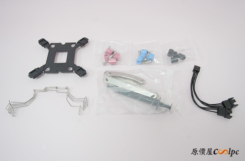 先看看安裝配件,各種腳位要用的底座圓柱及螺絲都幫大家分裝標示,Intel平台會多一個強化背板,還有風扇金屬扣具、風扇串接線,另外附上一條散熱膏供玩家使用。