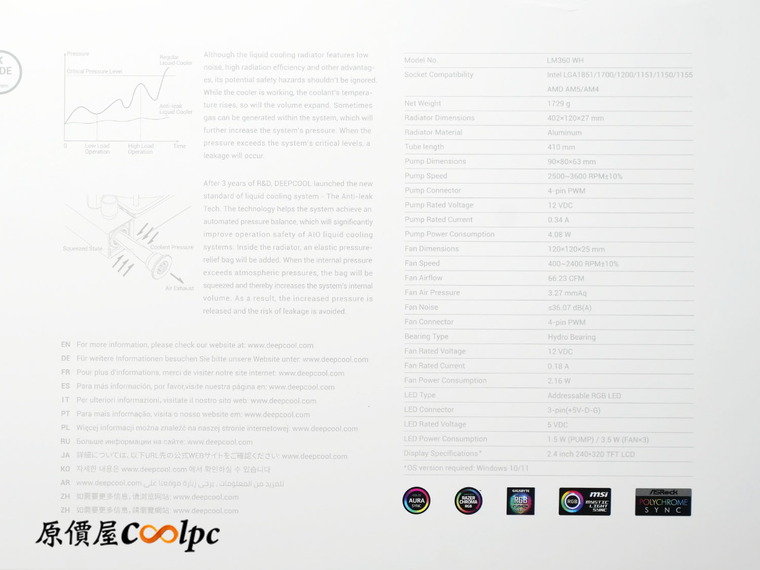 剛剛裝水冷的時候你偷看了對吧?水冷發展從無光到白光,再來有 ARGB 幻彩燈光,現在又有 LCD 顯示器…花樣越來越多!九州風神在所有元素具備的情況下,還能做出 C/P 價值!這回原價屋帶來 DeepCool LM360 WH 一體式水冷散熱器,2.4 吋 IPS 顯示器冷頭搶盡鋒頭,支援硬體監控與自訂 JPEG/PNG 圖片或 GIF/MP4 影片!搭配預裝幻彩星環三風扇,一條線便可串接完成,且燈光支援各大廠燈光同步軟體,DIY 組裝方便又整潔!更特別的是獨特的動態平衡卸壓(Anti-Leak)技術,內部壓力透過閥門控制,有效降低漏液風險並延長壽命。可支援主流 Intel LGA 1851/1700/1200/1151/1150/1155 及 AMD AM5/AM4 平台,水冷本體 5 年保固,LCD 螢幕 3 年保固,DeepCool LM360 黑/白雙色兩款都賣 NT$3690,在 DIY 市場算滿有競爭力了。有興趣的朋友可往下參考 DeepCool LM360 WH(白) 水冷散熱器的開箱。