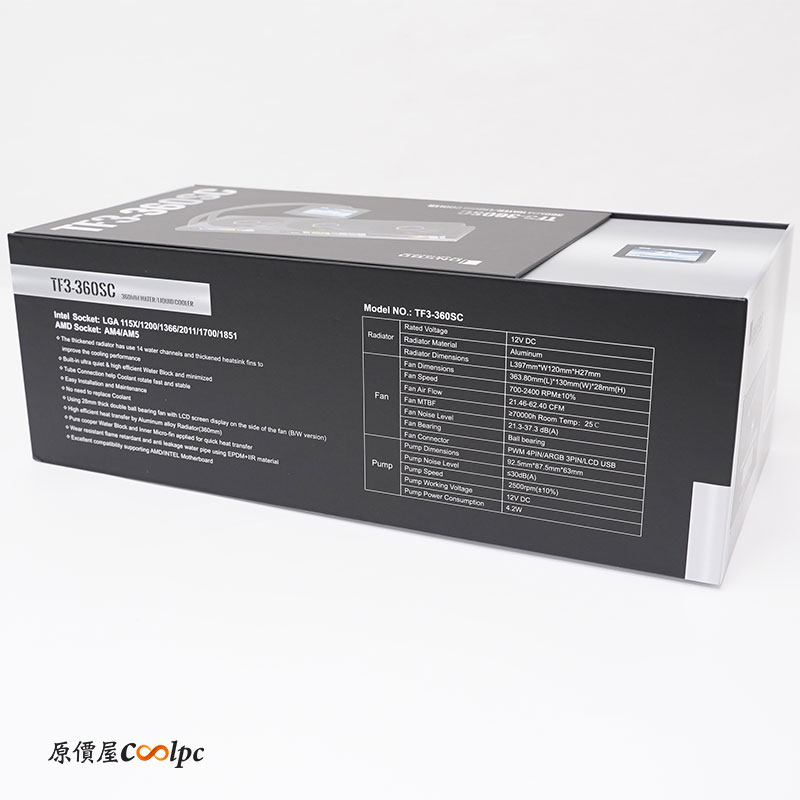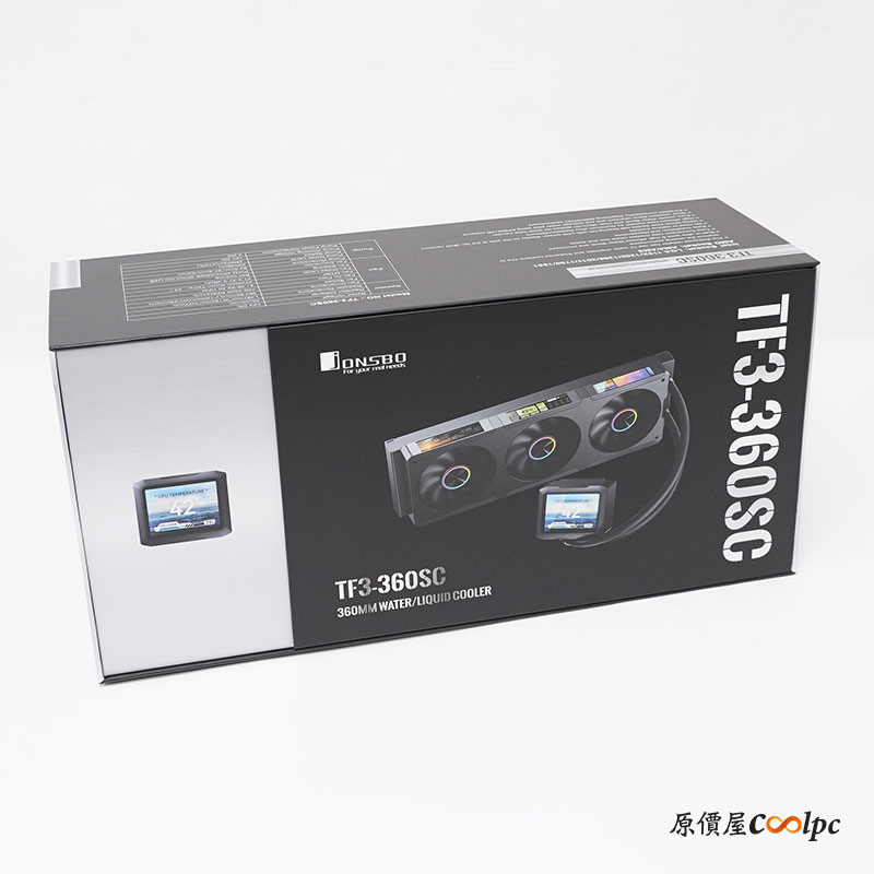 喬思伯 TF3-360SC 四螢幕一體式水冷採用彩盒包裝設計,中間的示意圖可以看到除了正中間的螢幕之外,風扇上都有獨立螢幕。