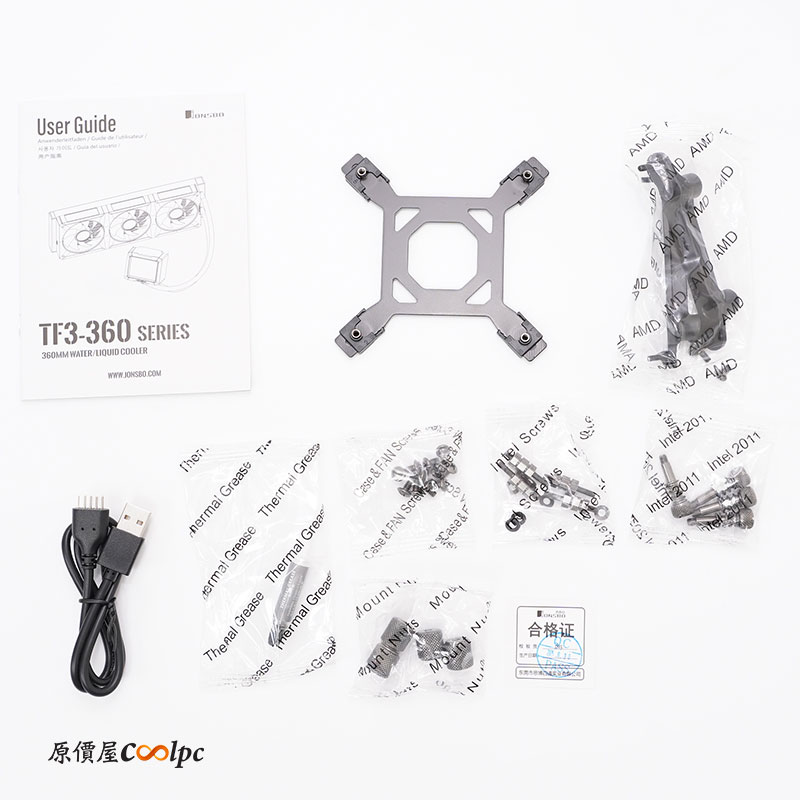 內部所有配件有水冷本體、USB2.0 公轉 USB-A 線材、使用手冊和配件組合包。