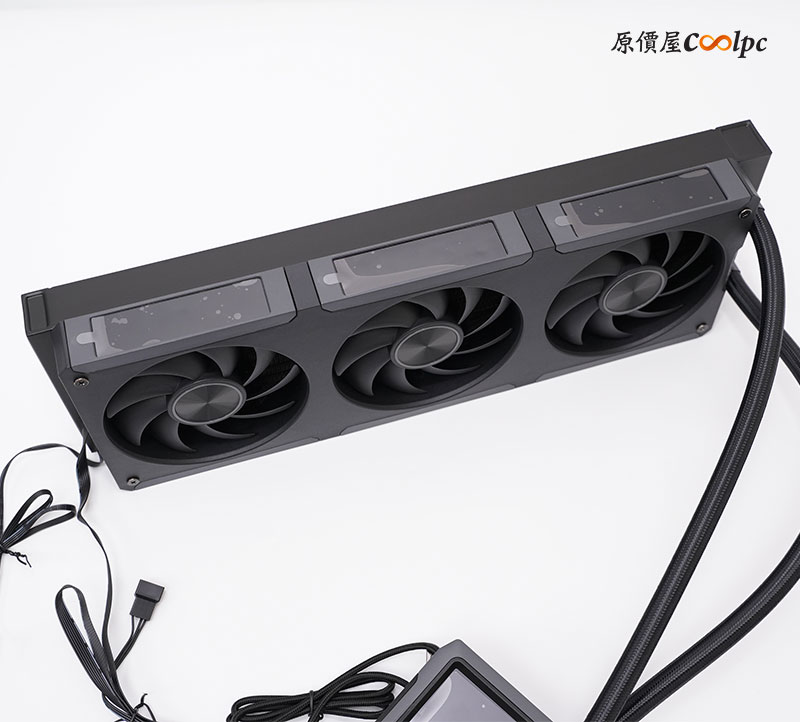 喬思伯 TF3-360SC 四螢幕一體式水冷,風扇採用一體式設計,為雙滾珠軸承,風量:21.46-62.40 CFM(each),轉速:700rpm~2400rpm(±10%),噪音:21.3-37.3 dB(A)(MAX);三顆風扇螢幕為磁吸式面板,尺寸為 3.38 英寸 IPS 面板,解析度 640*180 DPI,亮度 350 nits,可自訂 Gif/JPG/MP4 格式。