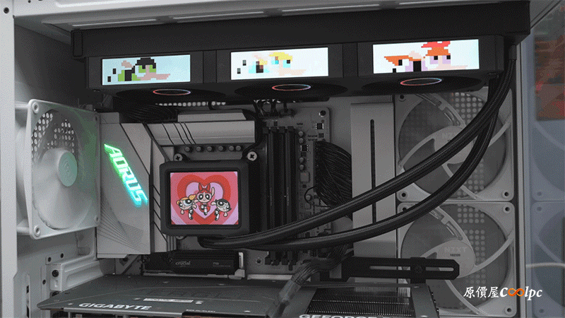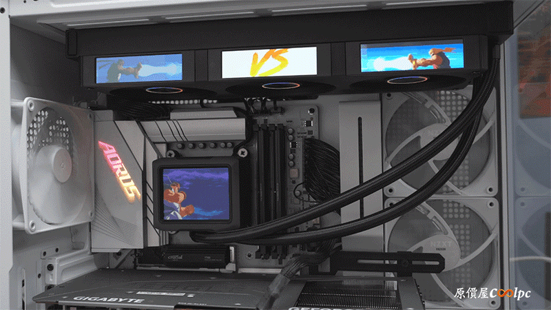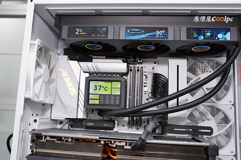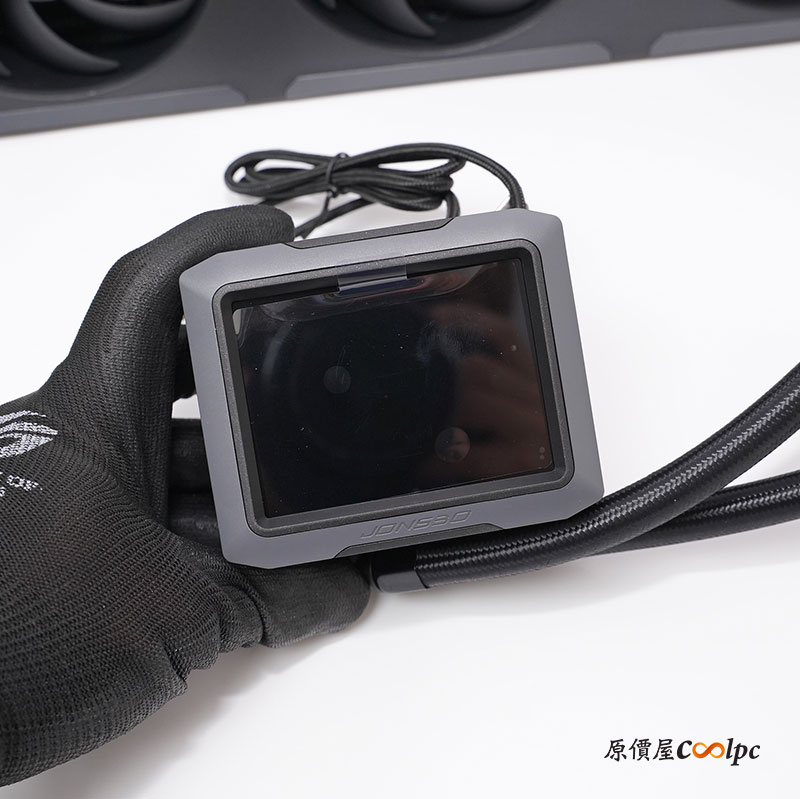 水泵上的螢幕為 3.5 吋 IPS 面板,解析度 640*480 DPI,亮度 350 nits,水泵轉速 2500 rpm (±10%),螢幕除了即時監控系統狀態之外,還能自訂 Gif/JPG/MP4 格式顯示在螢幕上。