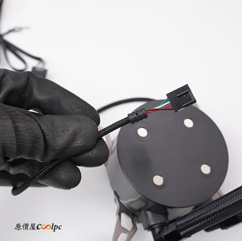 水冷泵供電採用編織線材 4Pin 供電,務必插在主機板 4Pin 插槽上。