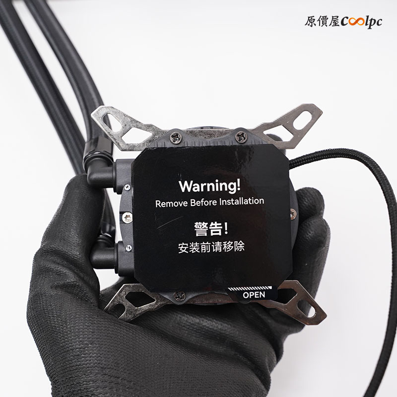 水冷頭底部有一張保護膠膜,出廠預先安裝 Intel 平台的固定座。