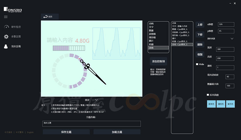 自定義的東西其實還蠻多樣化,像是有動畫、文字、數據、狀態條、弧形條、圖片、時鐘、表格等選項任意挑選,當然也支援圖片 PNG、JPG;動畫 MP4、GIF 格式。