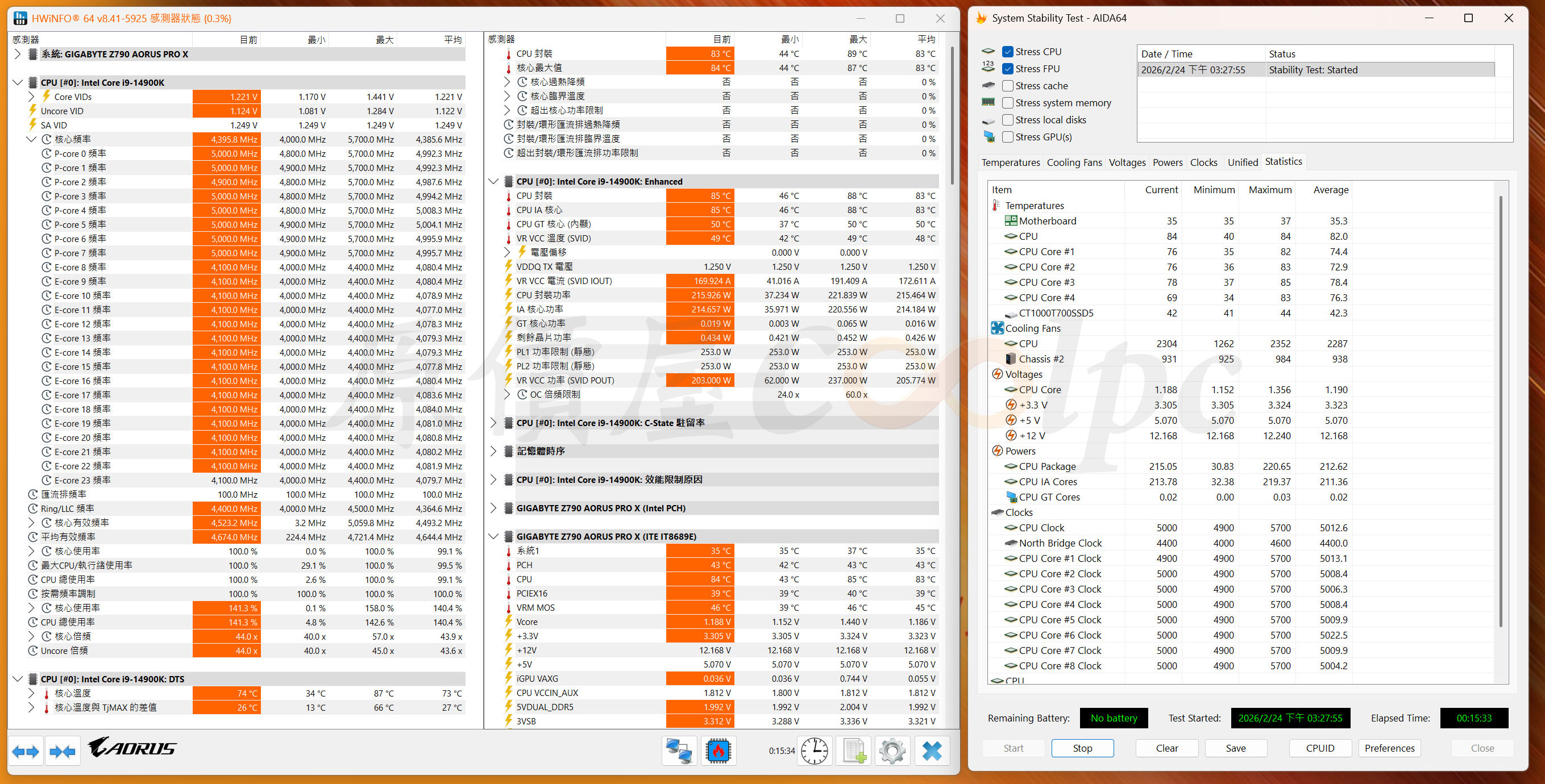 (點圖放大)接著測試水冷溫度壓制能力,使用 Intel Core i9-14900K 處理器,BIOS Intel Default Settings Performance 模式,透過 AIDA64 測試軟體約 15 分鐘,CPU 最大滿載約 220W,最高溫 88°C,核心時脈 P 核心 4.9~5.0 GHz,E 核心時脈 4.1 GHz。