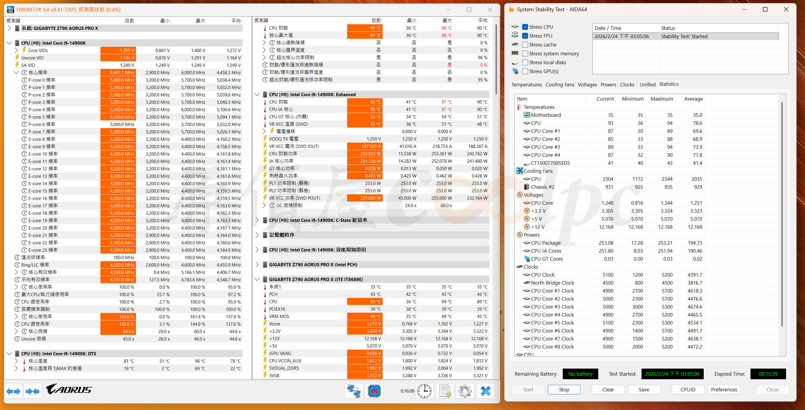 (點圖放大) BIOS Intel Default Settings Extreme 模式,一樣透過 AIDA64 測試軟體 15 分鐘,CPU 最大滿載約 253W,最高溫 97°C,核心時脈 P 核心 5.0~5.2 GHz,E 核心時脈 4.1~4.2 GHz,壓制能力相當不錯,CPU 253W 還有將近 5GHz 水準,溫度正常使用下不會完全都是跑滿載,不用擔心壓制不住頂級 Intel i9 或AMD Ryzen R9 處理器。
