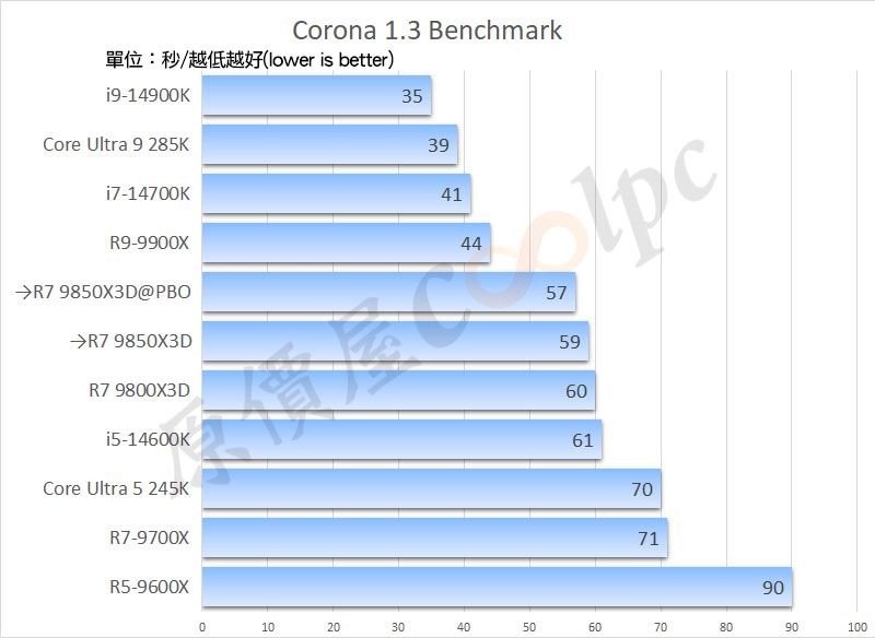 Corona 1.3 軟體主要針對 CPU 渲染性能做測試,數字越低表示速度越快。