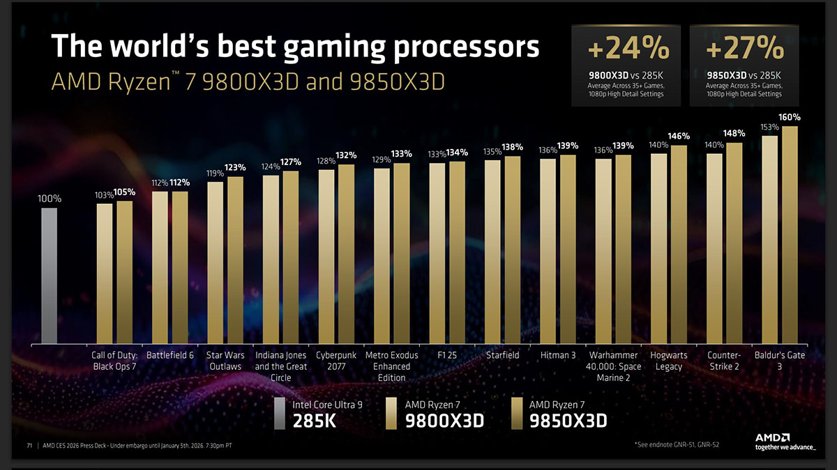 (點圖放大)根據官方簡報,9850X3D 對上隔壁棚最新的 Core Ultra 9 285K,展現了殘酷的遊戲效能差距。在電競遊戲中平均領先達 28%,而在《柏德之門 3》這種吃重 CPU 運算的大作,領先幅度甚至衝到誇張的 60%!這不只是領先,更是對手之間的技術斷層…