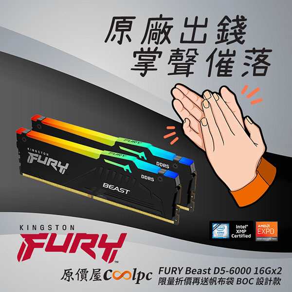 原廠出錢,掌聲催落!金士頓 FURY Beast DDR5 RGB 16GBx2 獸獵者記憶體。