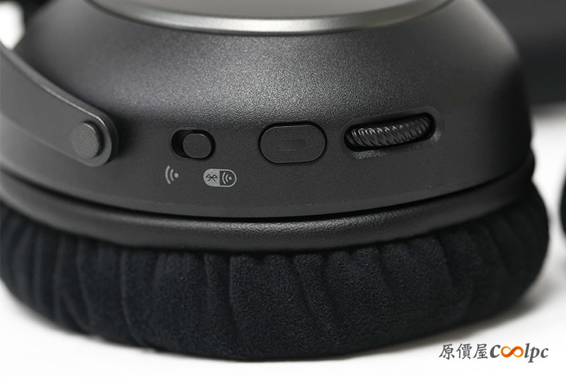 操作按鍵與接孔分布設置在兩邊的耳罩側邊。包含藍芽/2.4GHz 的模式撥鍵、音量滾輪、麥克風監聽。