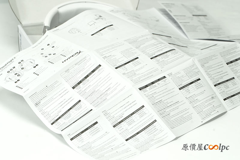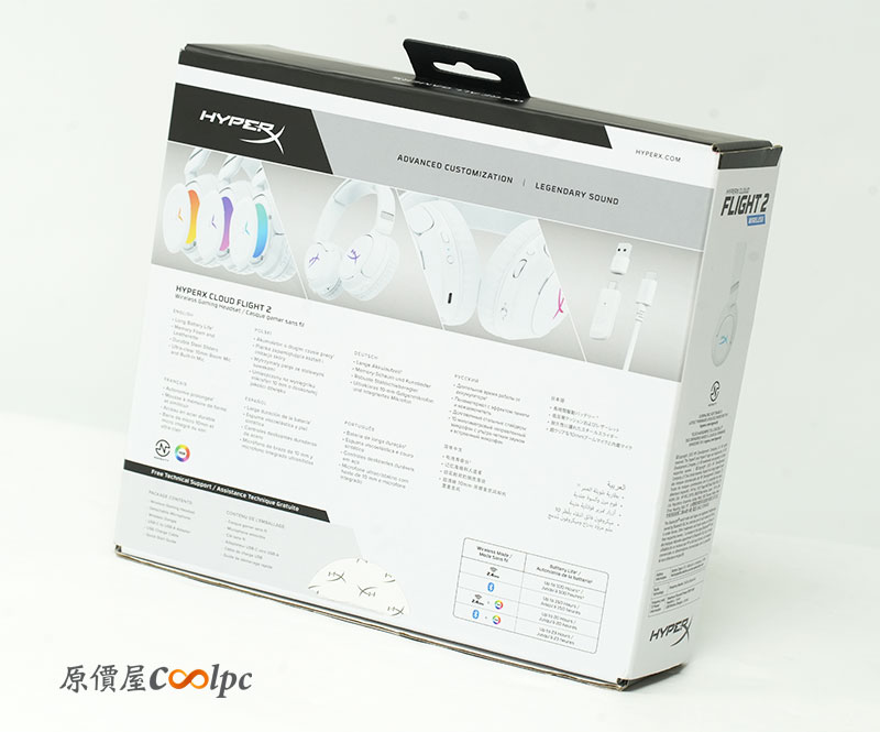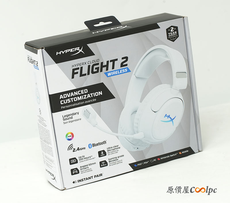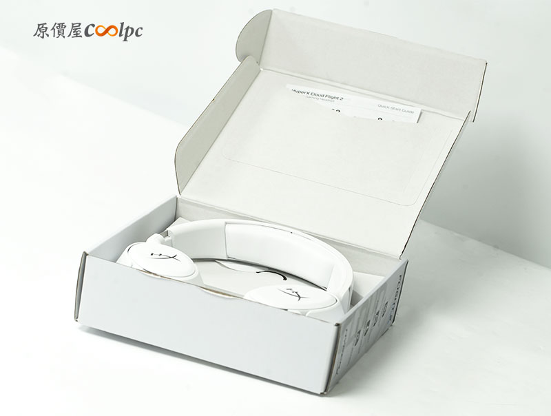 HyperX Cloud Flight 2 以白色系清爽外盒登場,產品外觀與主要特色一目了然。正面標示核心功能,第一眼就能感受到這款耳機的定位相當完整。