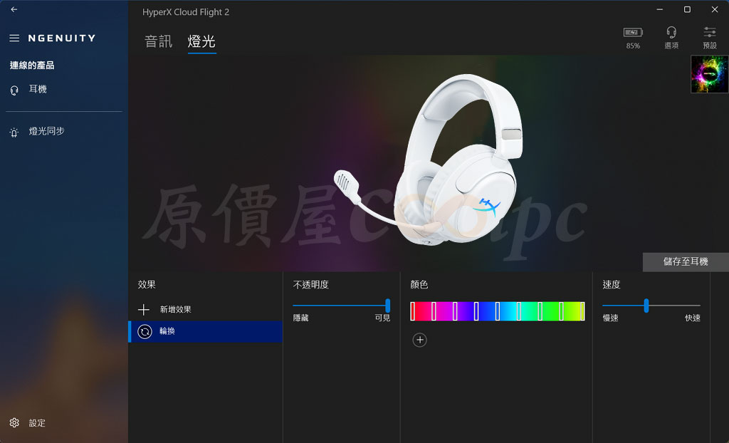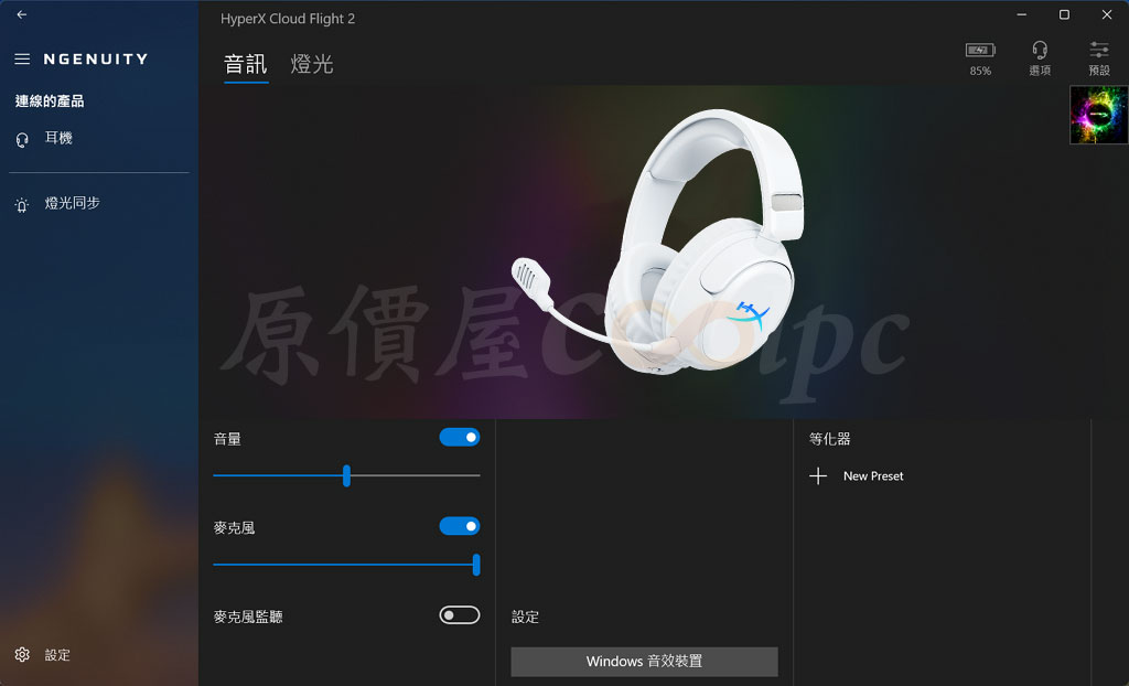 也別忘了到官方那邊下載 HyperX NGENUITY 軟體。NGENUITY 提供 RGB 色彩模式,可支援多種燈效組合,可細調亮度與切換節奏。另外也有聲音與麥克風調教介面,可快速變更 EQ、麥克風降噪、音量等參數。