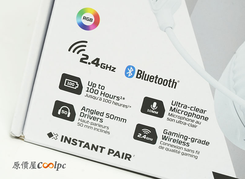 外盒上列出多項功能包含 100~150 小時續航、多種連線方式、RGB燈效、可替換耳蓋、多平台支援。標示清楚,讓玩家在購買前就能快速掌握產品特性。