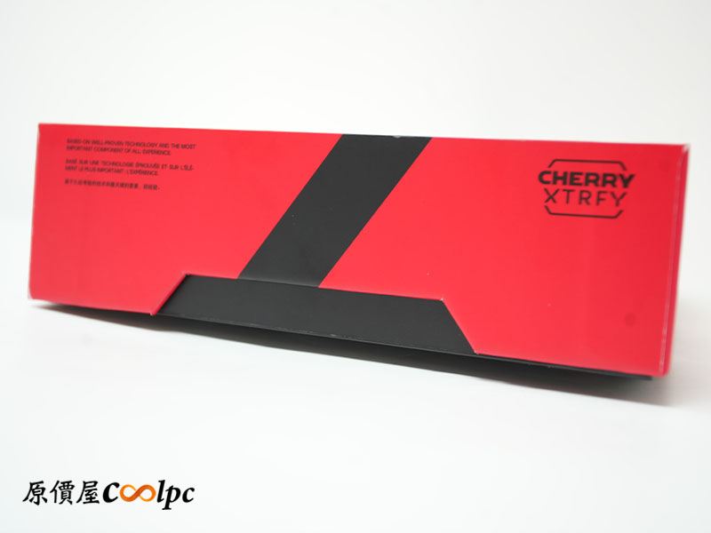 包裝維持 Cherry 辨識度超高的黑底櫻桃紅配色。外盒右上角直接標示 8K Hz 輪詢率(有線)和 MX LP 2.0 紅軸,側面則強調三模連線、矮軸、RGB 燈效等產品重點。整個外盒做得像高質感禮盒,是很貼合的硬紙盒,側邊特別設計了開孔來提升開箱體驗。